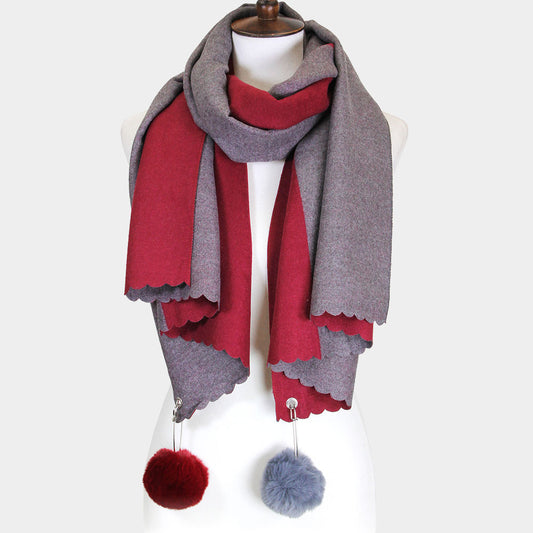 Fall/Winter Reversible Soft Scarf With Pom-Pom Accents Burgundy