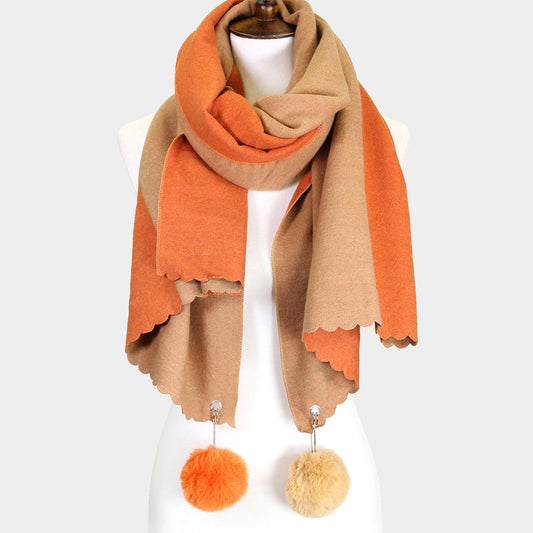 Fall/Winter Reversible Soft Scarf With Pom-Pom Accents Coral