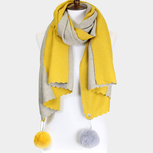 Fall/Winter Reversible Soft Scarf With Pom-Pom Accents Mustard