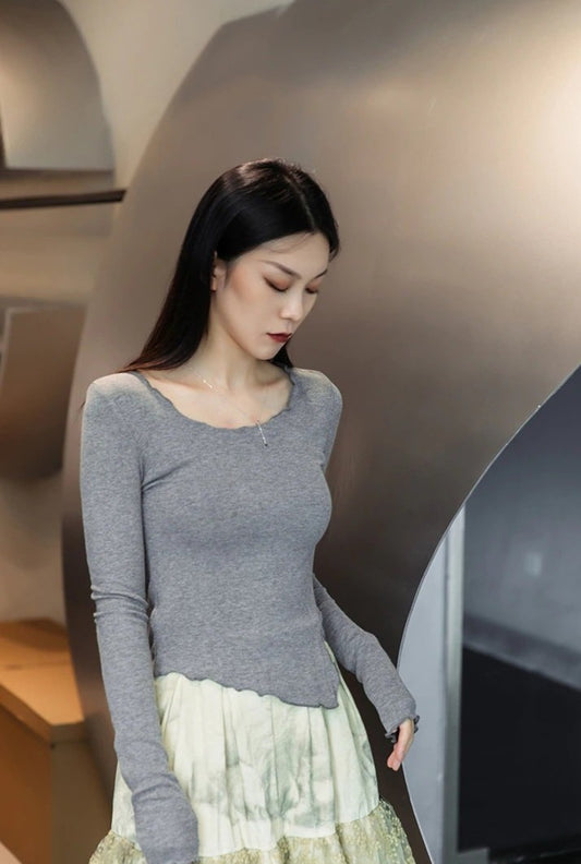 Asymmetrical Split Hem Tee Long Sleeve Gray