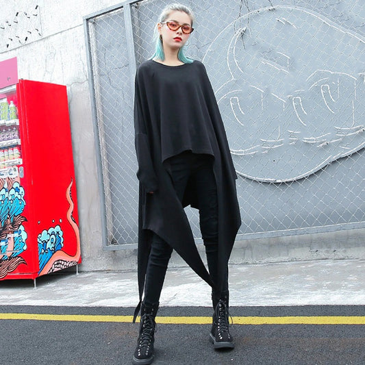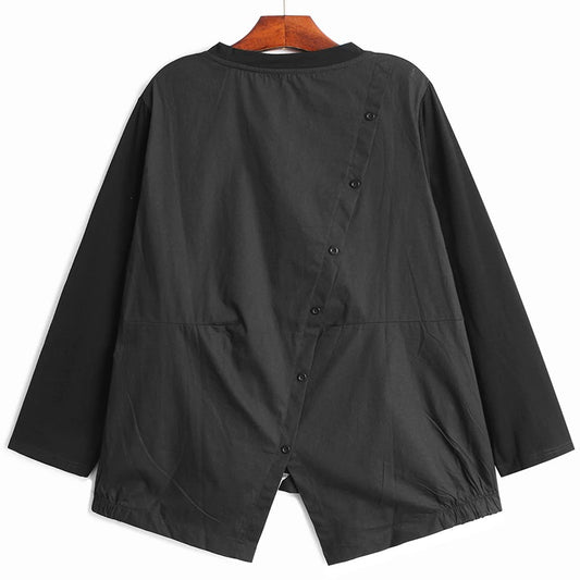Irregular Hem Jersey Rounded Collar Long Sleeve Top Black