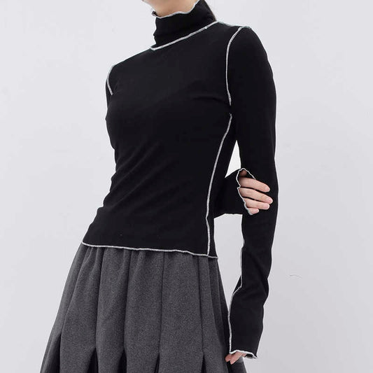 High Collar Long Sleeve Solid Color Black Split Joint T-shirt Black