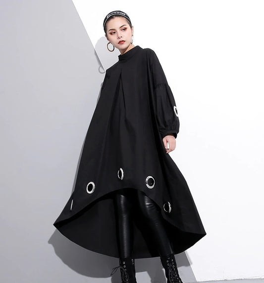 Grommet Accent Disks High Low Dress Long Sleeve Black