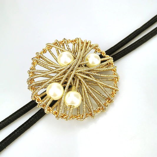 Long Necklace Woven Pendant with Faux Pearls Black Cord and Gold