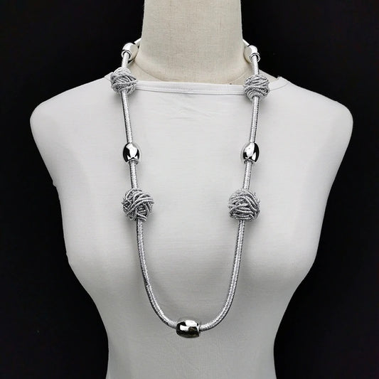 Silver Cord and Bead Long Necklace with Knotted Design Accents