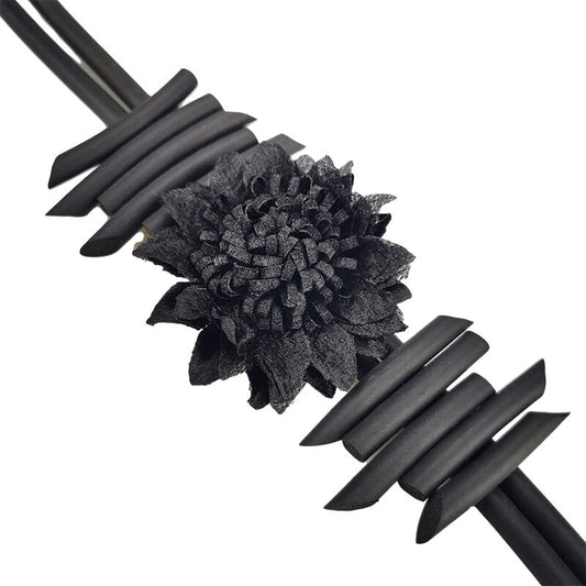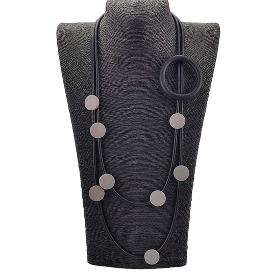 Recycled Rubber/Silicone Long Necklace Circle Décor with Wood Accents Multi Strands. Grey/Black