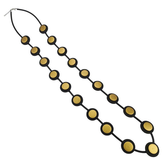 Recycled Rubber/Silicone Long Small Circle Necklace with Wood Disks Black/Gold