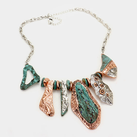 Geometric Tri-tone & Patina Pendant Necklace Silver,Copper,Patina 17" with ext