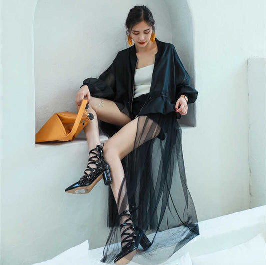 Long Sleeve Zip Long Hem w/ Mesh Skirt Shirt/Duster in Black