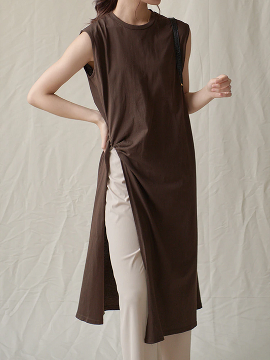 Sleeveless Long Crew Neck Tee w/ Side Slit and Knot Detail in Coffee