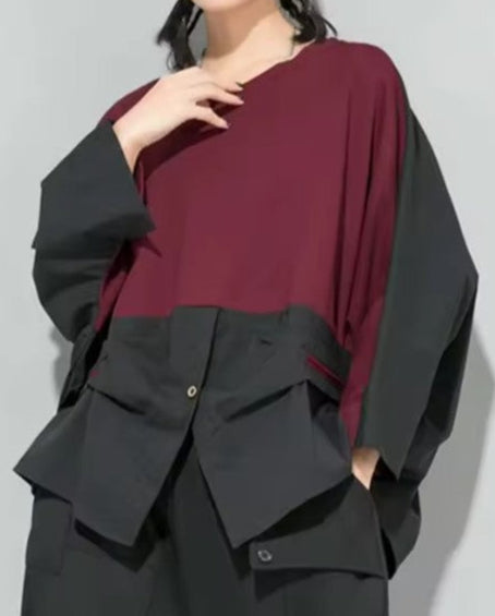 Two-Tone Burgundy & Black Asymmetrical Top Round Collar Long Sleeved Button Detail