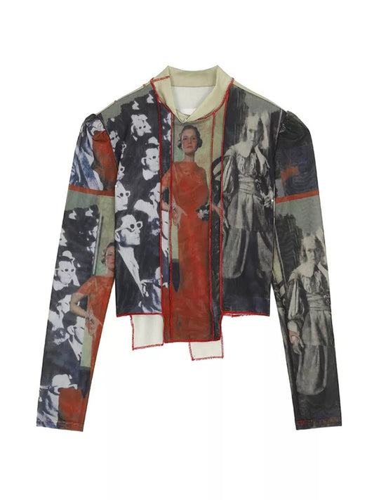 Sheer Mesh Tee Long Sleeve Blue with Raw Hem Pop Art